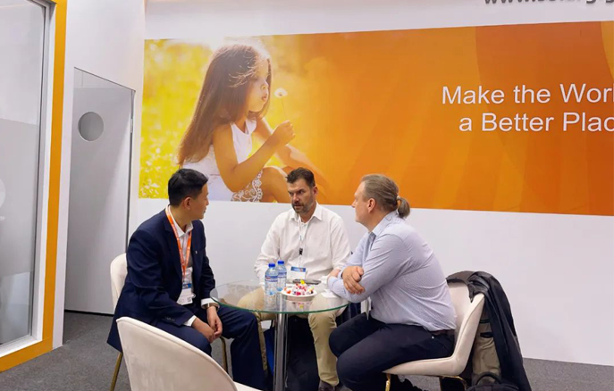 本屆德國展,陽光能源展出了我司的“明星產(chǎn)品”——GIGA系列組件,其卓越的性能和高效的轉(zhuǎn)換效率,深受客戶好評?,F(xiàn)場,陽光能源工作人員還與來自世界各地的業(yè)內(nèi)人士展開了深度交流與業(yè)務(wù)洽談。