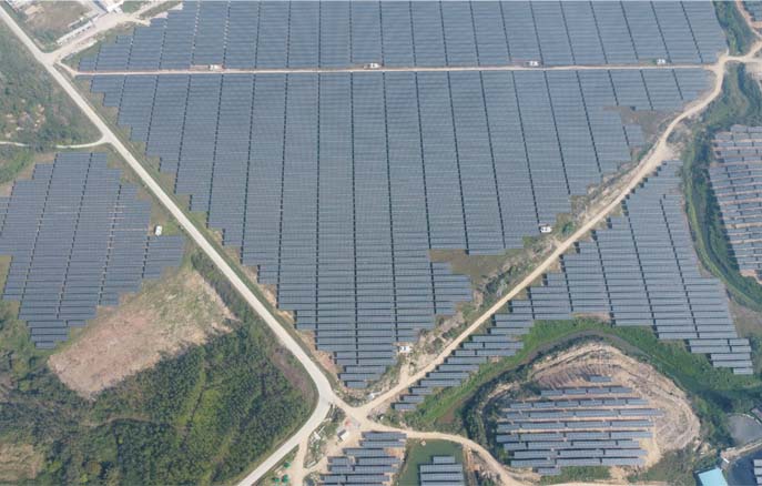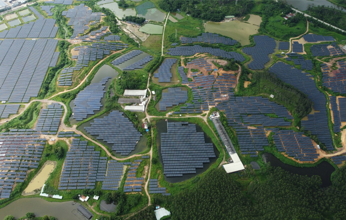 值得一提的是,廣東省開(kāi)平市150MW光伏項(xiàng)目綜合采用了“農(nóng)光互補(bǔ)+漁光互補(bǔ)”新型發(fā)電模式——板上光伏發(fā)電,板下土地進(jìn)行農(nóng)業(yè)種植、板下水域進(jìn)行漁業(yè)養(yǎng)殖——滿(mǎn)足周邊用電需求的同時(shí),還實(shí)現(xiàn)了電力與農(nóng)業(yè)、漁業(yè)的有機(jī)結(jié)合,實(shí)現(xiàn)三重經(jīng)濟(jì)收益。從高空俯瞰,耕地、漁田與陽(yáng)光組件交相輝映,波瀾壯闊。