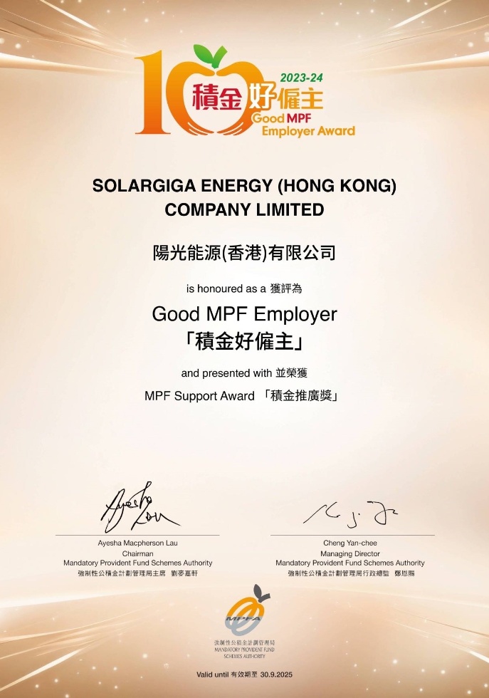 近日,陽光能源控股有限公司(以下簡稱“陽光能源”)旗下陽光能源(香港)有限公司憑借以人為本的理念和企業(yè)社會責(zé)任的踐行,被香港強(qiáng)制性公積金計(jì)劃管理局(MPFA)授予“積金好雇主”稱號和“積金推廣獎”榮譽(yù),是陽光能源推進(jìn)集團(tuán) ESG 工作的重要實(shí)踐,更是香港政府機(jī)構(gòu)對我司建設(shè)優(yōu)秀雇主品牌、踐行 ESG 理念工作的充分認(rèn)可。