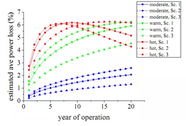 結(jié)果如圖所示,在炎熱地帶,年發(fā)電損失約達(dá)到5%,當(dāng)達(dá)到最大衰減以后,第7年以后組件在熱輔助的作用下開始功率恢復(fù),但是恢復(fù)的程度有限,需要花費(fèi)的時(shí)間也很長(zhǎng),如圖則需要10年以上。在溫暖地區(qū),第5年功率衰減達(dá)到4%左右。在中性氣候地區(qū),影響較小。