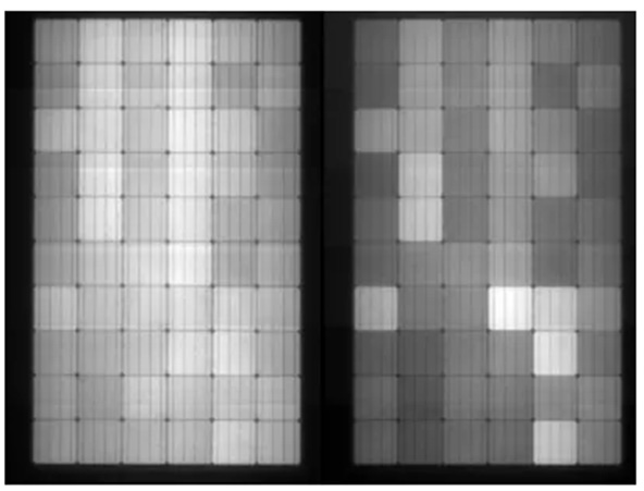 2019年9月,F(xiàn)raunhofer 實(shí)驗(yàn)室MatthiasPander團(tuán)隊(duì)公開發(fā)表了《Prediction of potential power/field lossfrom LeTID susceptible modules》,論文對(duì)LeTID組件的功率衰減進(jìn)行了詳細(xì)的研究,如下圖為經(jīng)過690h測(cè)試后的單晶PERC組件EL照片,組件內(nèi)部的電池亮度均勻性變差,部分電池已經(jīng)呈現(xiàn)性能衰減。